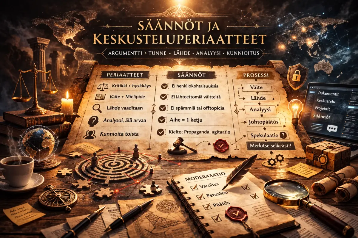 Jokainen uusi dokumentti avaa oman keskusteluketjunsa. Keskustelun lähtökohta ei ole mielipide, vaan argumentti: mitä väitettiin, mihin se perustui, mikä jäi avoimeksi ja mitä pitäisi tutkia seuraavaksi.